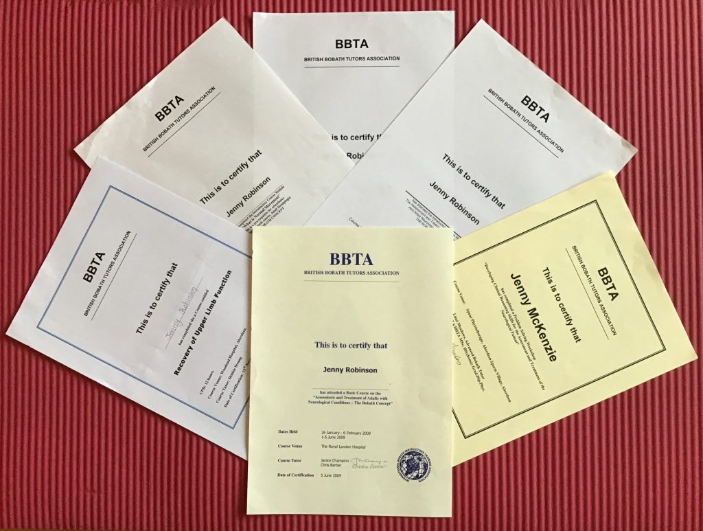 Over the years I have completed training in the Bobath Concept with the British Bobath Tutors Association. These internationally recognised courses promote motor learning for efficient motor control, with the aim to improve movement and function in people with neurological conditions.